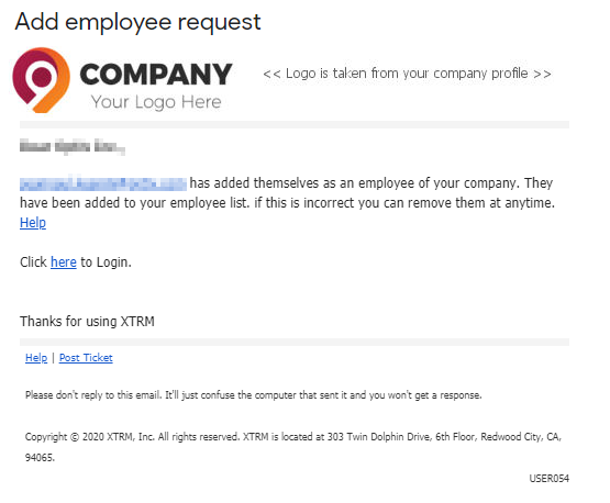 This document outlines the process and notifications related to a user adding themselves as an employee of a company account. To notify company administrators or relevant users when someone adds themselves as an employee of a company account.