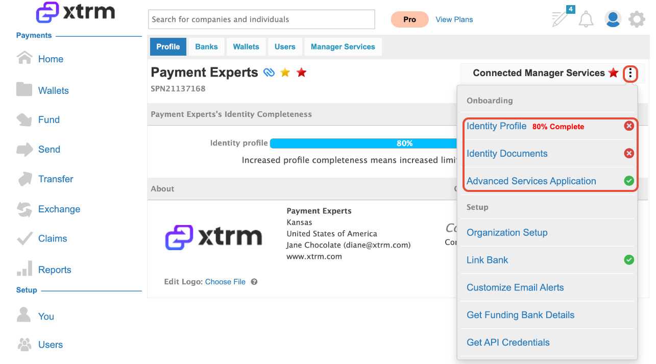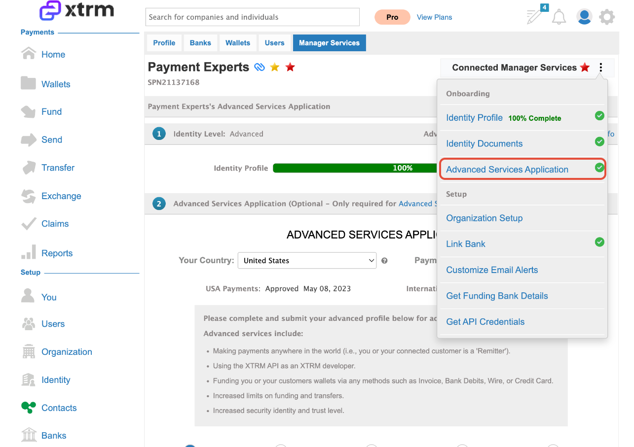 Note: Advanced services are required for connected companies to access features such as payment remittance. Identity profile must be 100% complete before submitting the Advanced Services Application.
