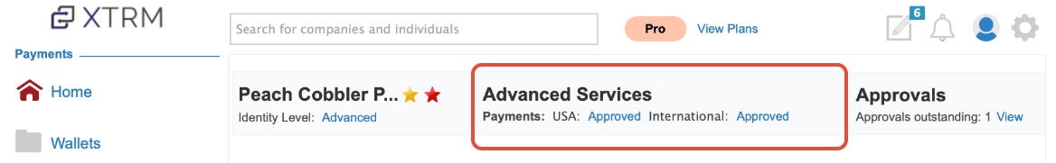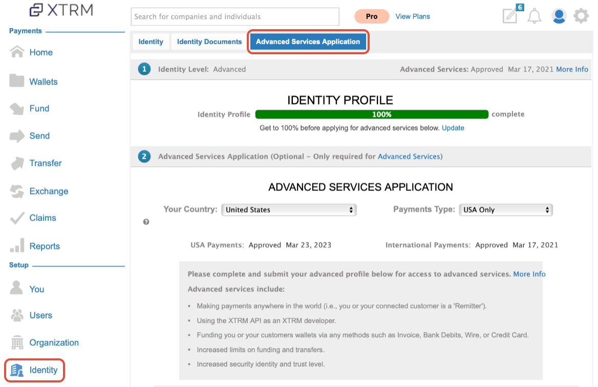 - Apply for Advanced Services on the "Home" or "Identity" page.