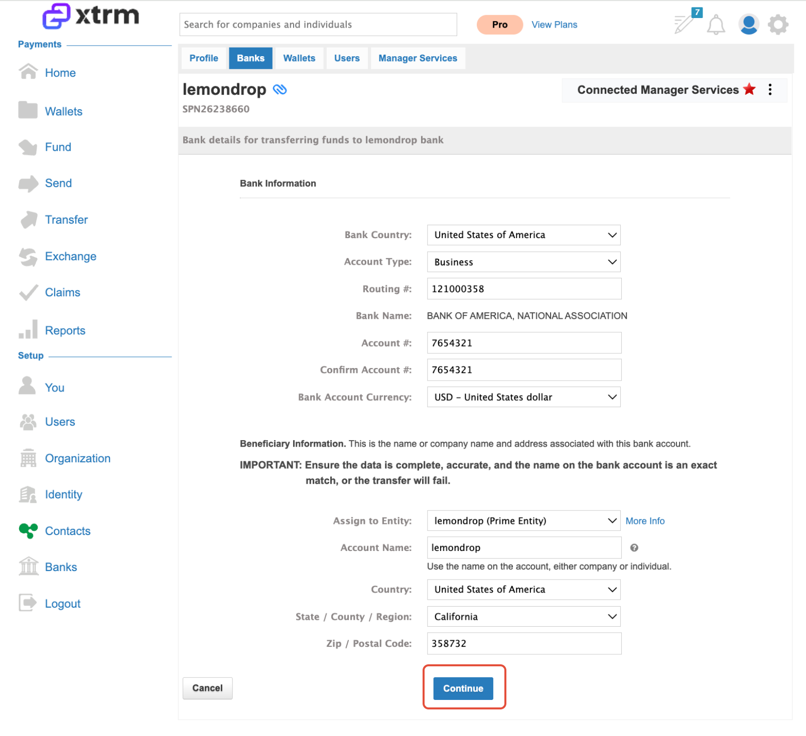 This enables incoming wallet payments to be automatically routed to a designated bank account, allowing beneficiaries to receive funds without logging into Xtrm.